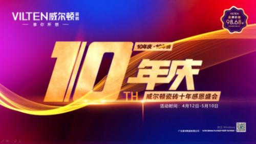 黃金十載,成就輝煌。為感恩新老客戶的支持和信任,4月12日至5月10日,威爾頓瓷磚禮遇相誠(chéng),特舉辦“十周年感恩盛會(huì)暨百團(tuán)大戰(zhàn)啟動(dòng)會(huì)”,本次活動(dòng)以“十年慶·十年情”為主題,旨在回顧威爾頓十年來(lái)發(fā)展歷程,...