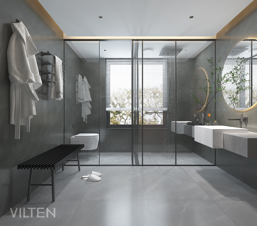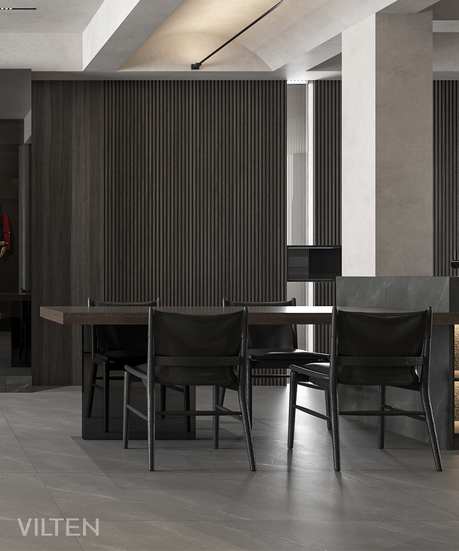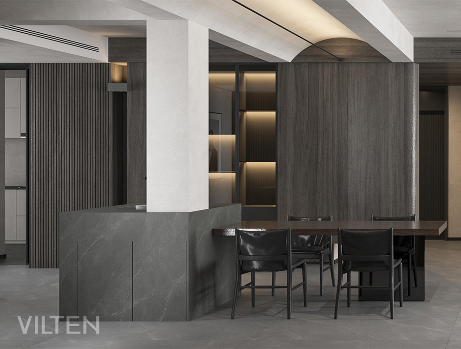 深邃的理石地面與灰胡桃木作為空間背景,襯托一幀幀生活的場景,徐徐盈溢。嫻靜自得,氤氳升騰于湛湛心空之上。內斂,依然有著生動的平靜,心的變奏曲悄然涌生出細膩不息的力量。